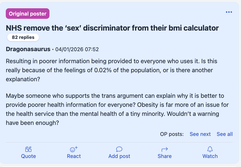 Various posters weigh in (no pun intended) on the factual claims, some noting that the change is not recent and others observing that most BMI calculators do not ask this information since it is irrelevant to the data produced and, the NHS says, it was only used in tailoring recommendations based on BMI. This thread exemplifies why the information should not be asked; it gives a false impression that this data is utilized in calculating BMI. If they ask you to input sex the presumption is that information is relevant for the output you receive. The posters have a preconceived notion that sex matters and therefore the information should be collected and that the information should be collected because sex matters, a classic case of begging the question.