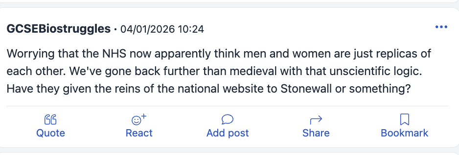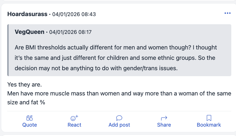 Further in the thread some posters land on a deeper critique of BMI more generally as a tool but their paranoid reading does not not allow this information the change their position that sex must be recorded and that the failure to do so is evidence of sinister motives. As a poster correctly noted, BMI is simply a ratio of height to weight plugged into actuarial tables based on 19th century Belgian men by a mathematician who was looking for population-level patterns. And, yes, this does reflect a general pattern of generalizing “human” from “men” which we can agree is a problem, particularly when BMI is used to make general claims beyond “this is how you compare to averages among this very limited data set.”